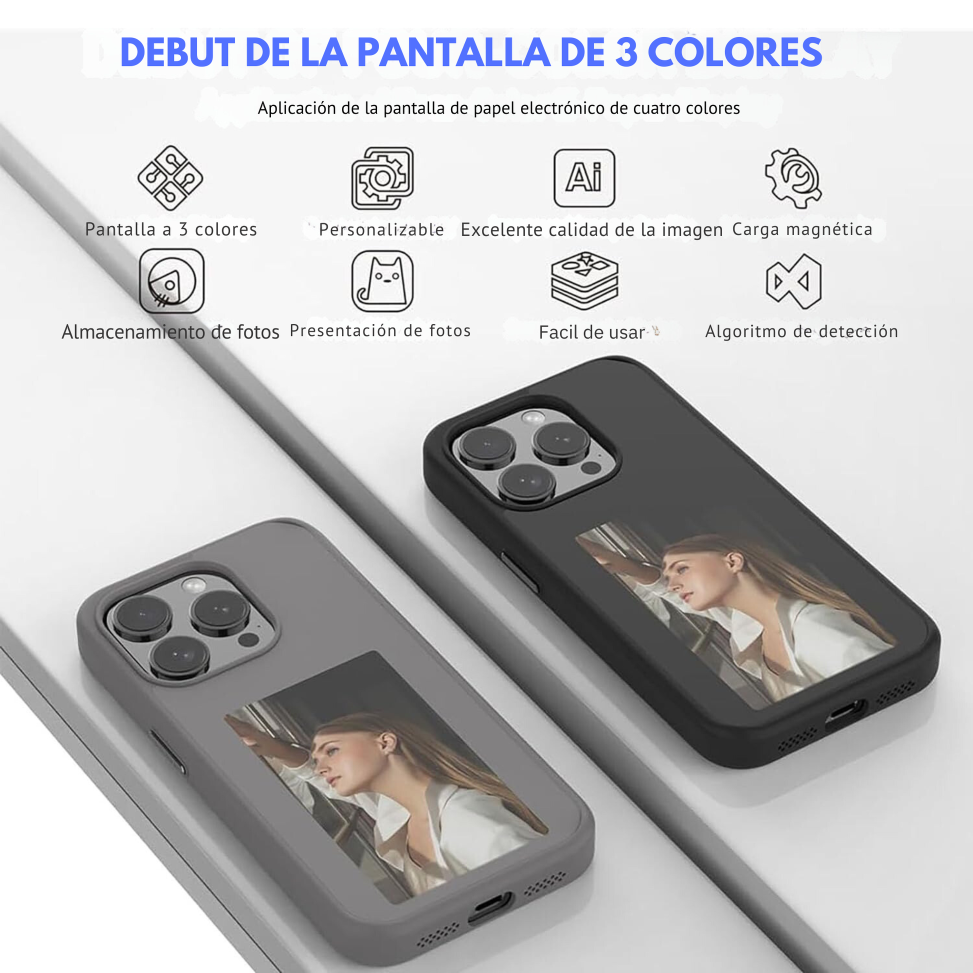 Esta funda integra tecnología de tinta electrónica (E Ink) y un chip NFC, permitiéndote personalizar la imagen cuantas veces quieras directamente desde tu teléfono.