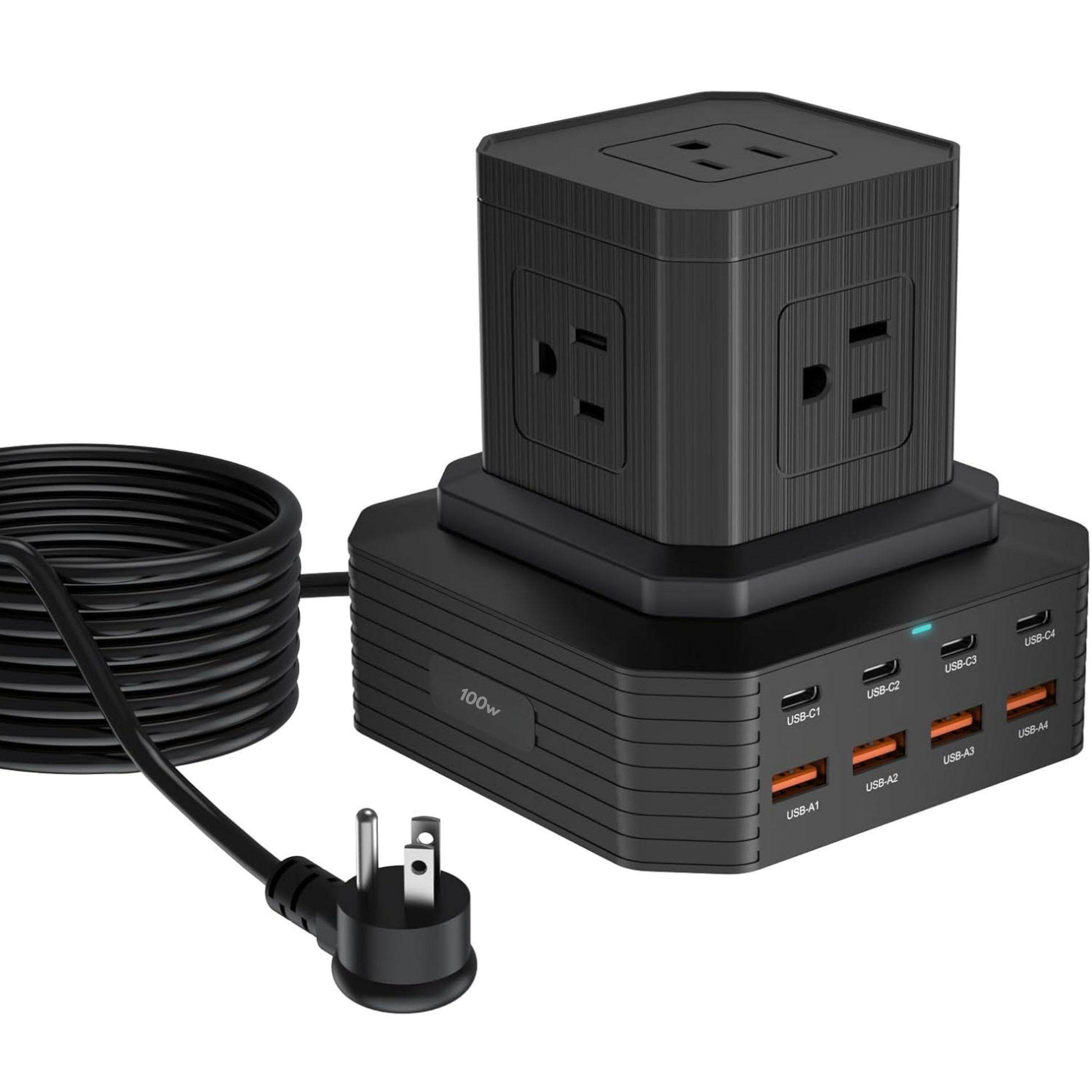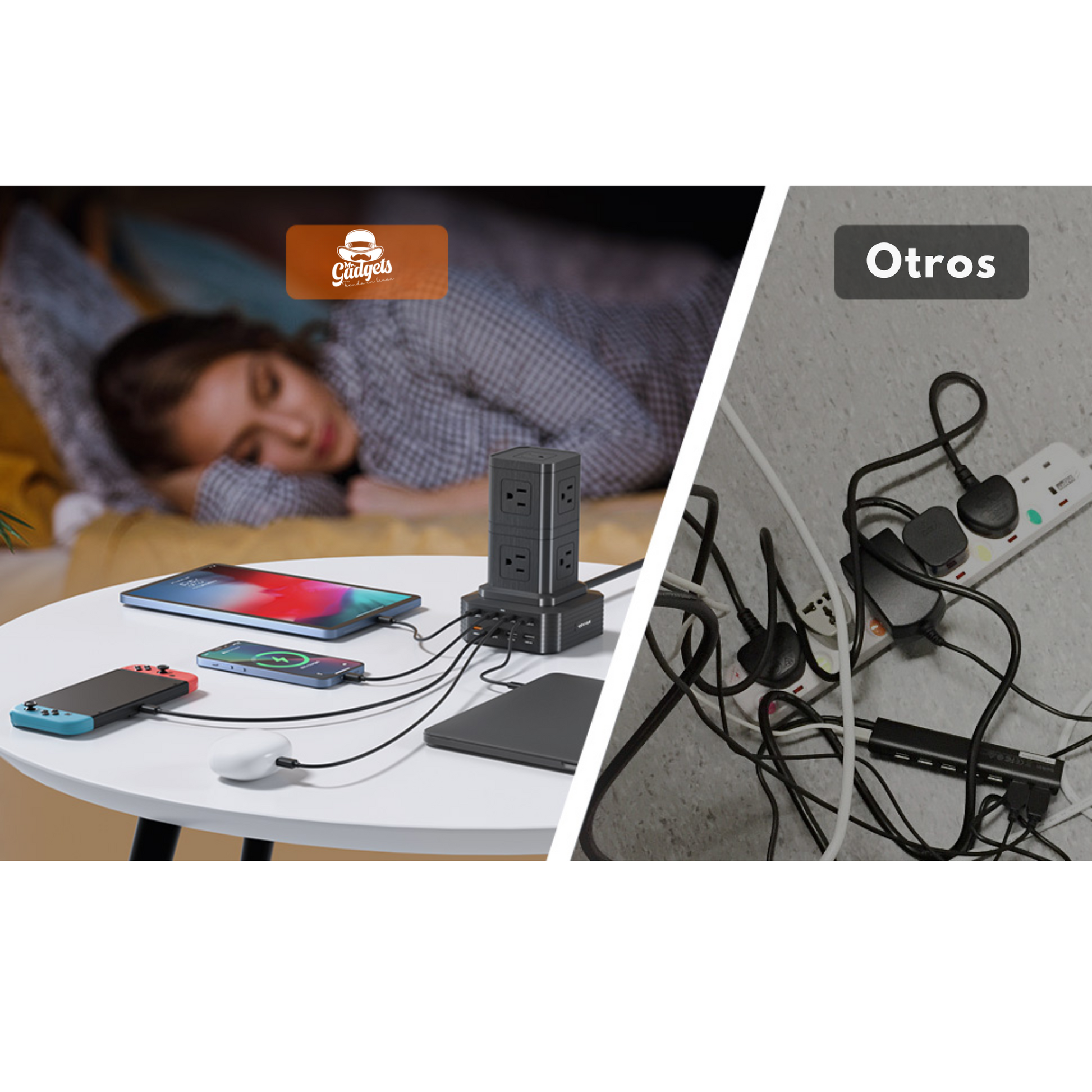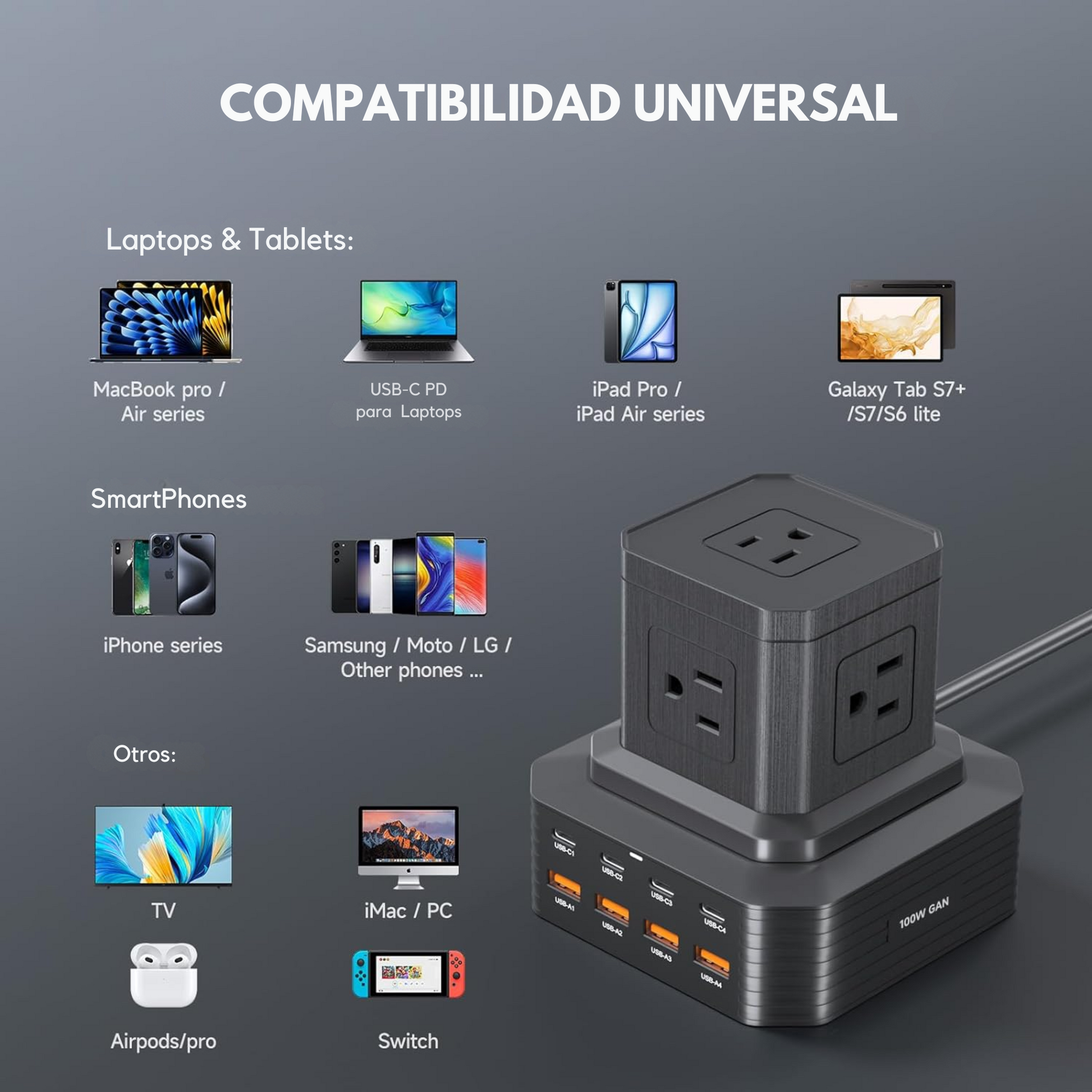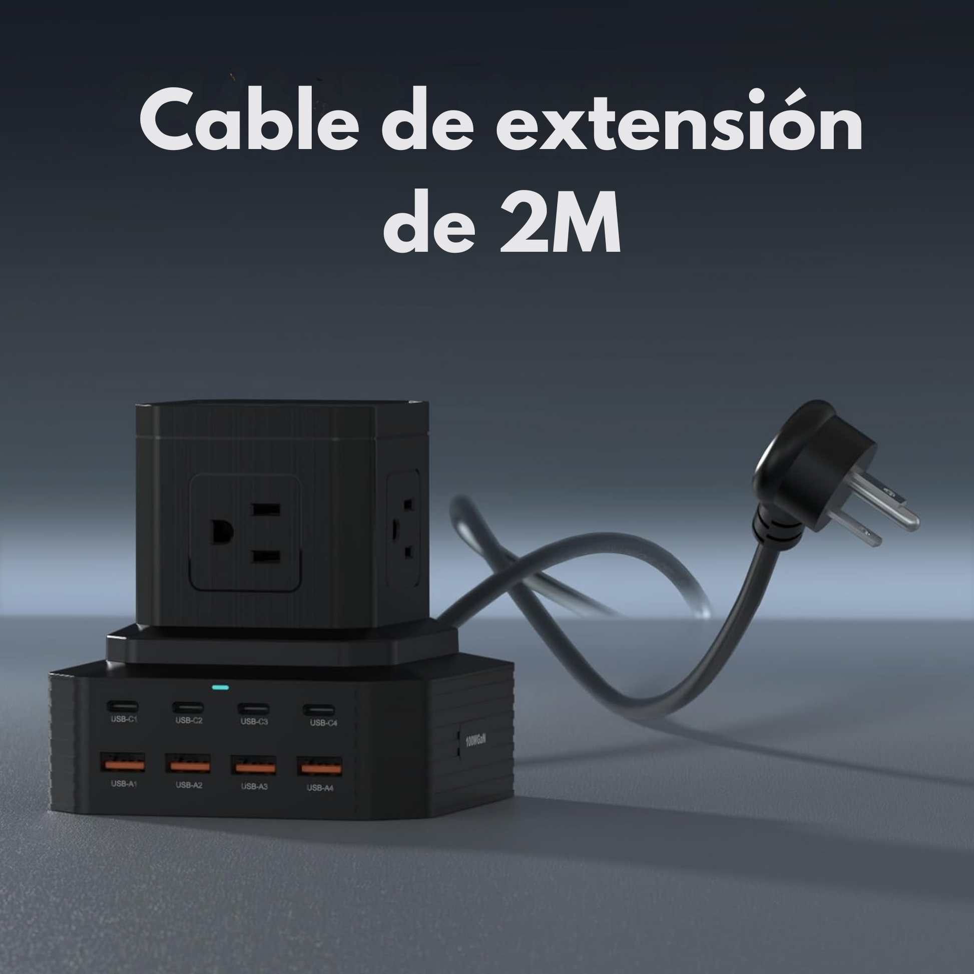 Puertos de salida: 2× USB-A (5 V/2,1 A), 1× USB-C (5 V/2,1 A), 1× Lightning integrado (5 V/2,1 A).